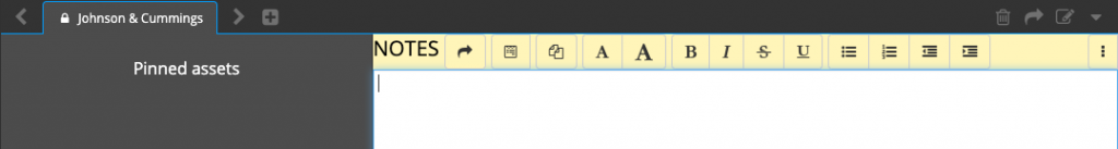 Adding more workspaces or notes within a story is easily done by clicking on the plus symbol next to the displayed titles. For instance, clicking on the plus symbol next to “Johnson & Cummings” adds a new workspace, while the titles of the notes are underneath the message field.